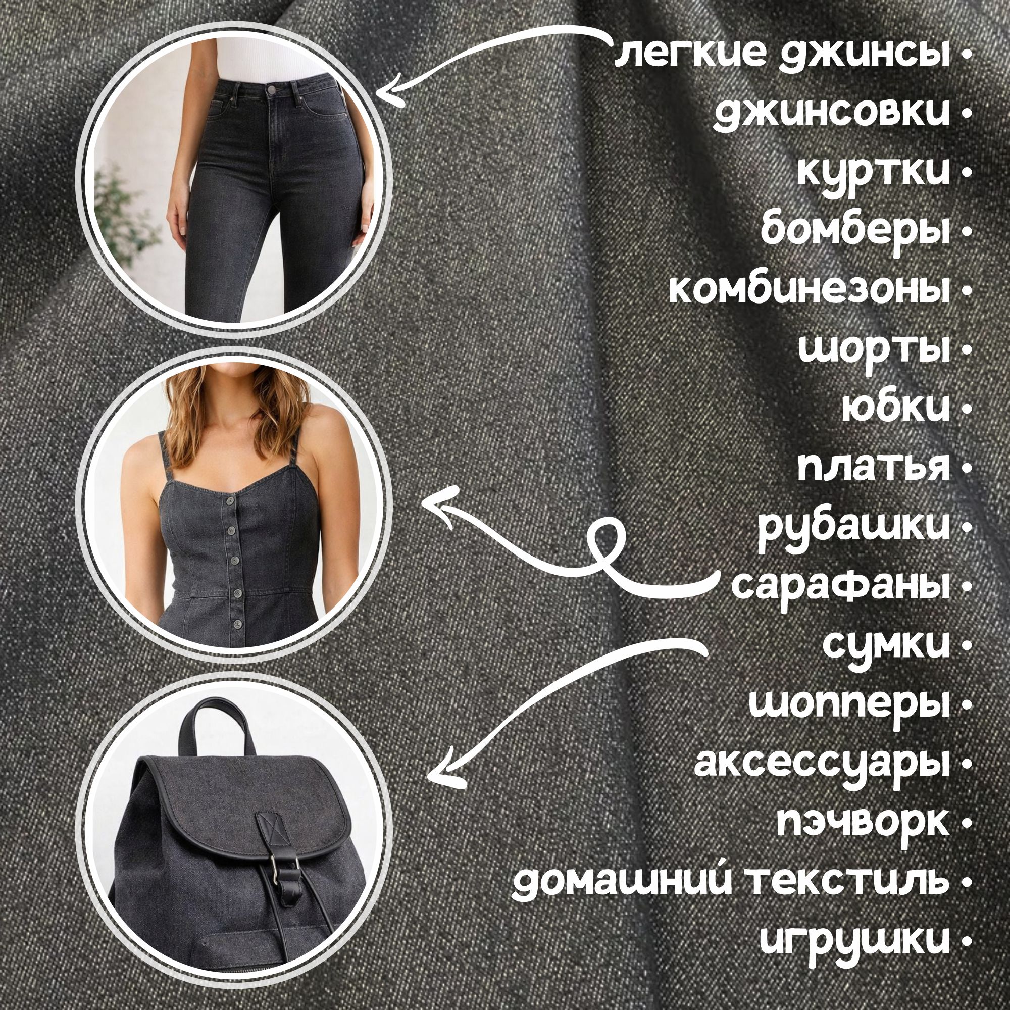Материал используется для пошива повседневной одежды для детей и взрослых, таких как: джинсы, джинсовки, куртки, бомберы, комбинезоны, шорты, юбки, платья, рубашки, сарафаны, сумки, шопперы и другие аксессуары. Джинса может использоваться как: ткань для интерьера, ткань для дизайна, ткань для пэчворк, ткань для декора.