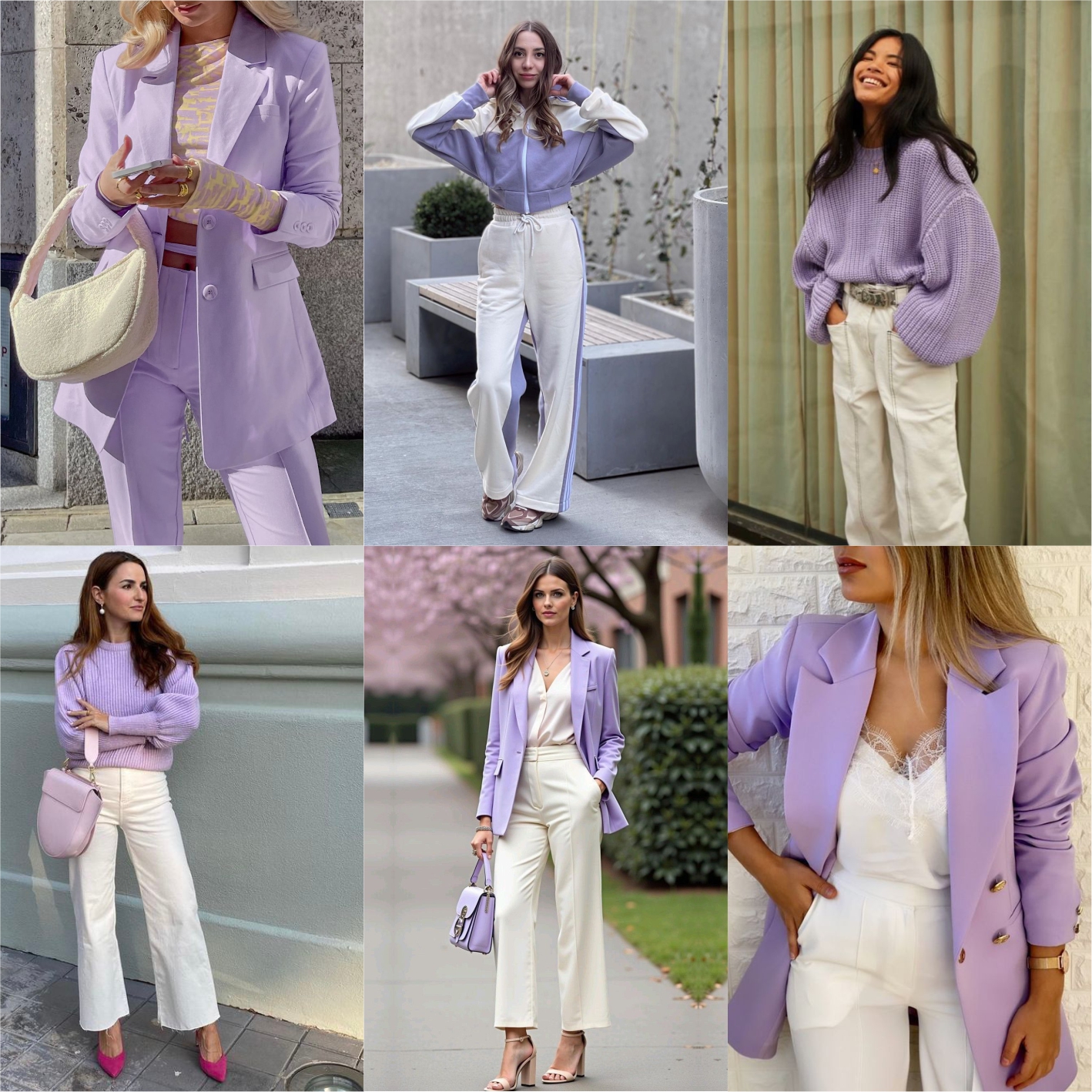 Это сочетание — воплощение нежности и романтики. Лиловый цвет привносит в образ нотки загадочности, а кремовый добавляет мягкости. Такой дуэт отлично подойдет как для повседневных, так и для более торжественных случаев.
