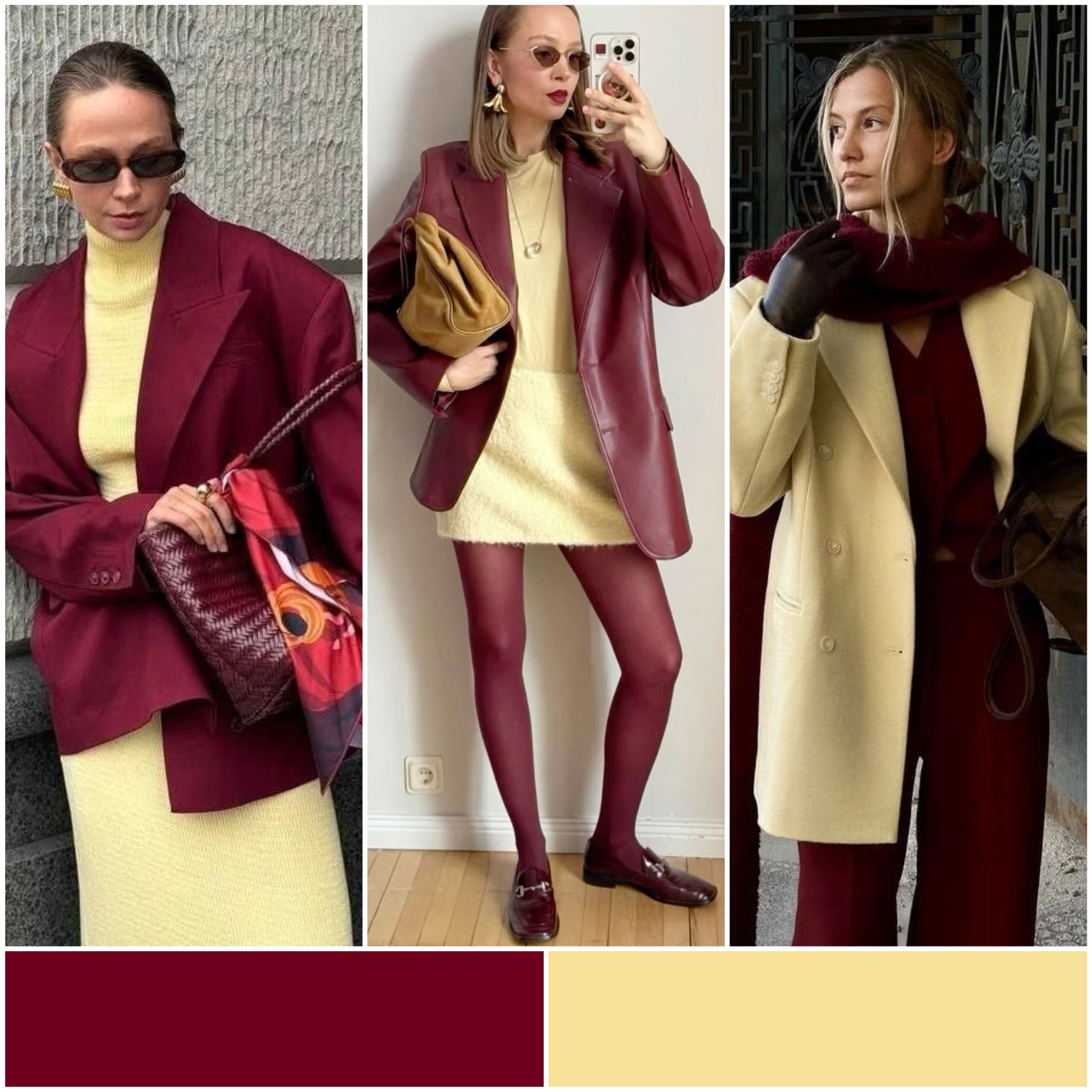 Эти два цвета прекрасно дополняют друг друга, создавая романтичный и элегантный образ. Винный придаст насыщенности, а сливочный — мягкости. Комбинируйте винную юбку с сливочным свитером или наоборот, чтобы создать гармоничный и стильный лук.