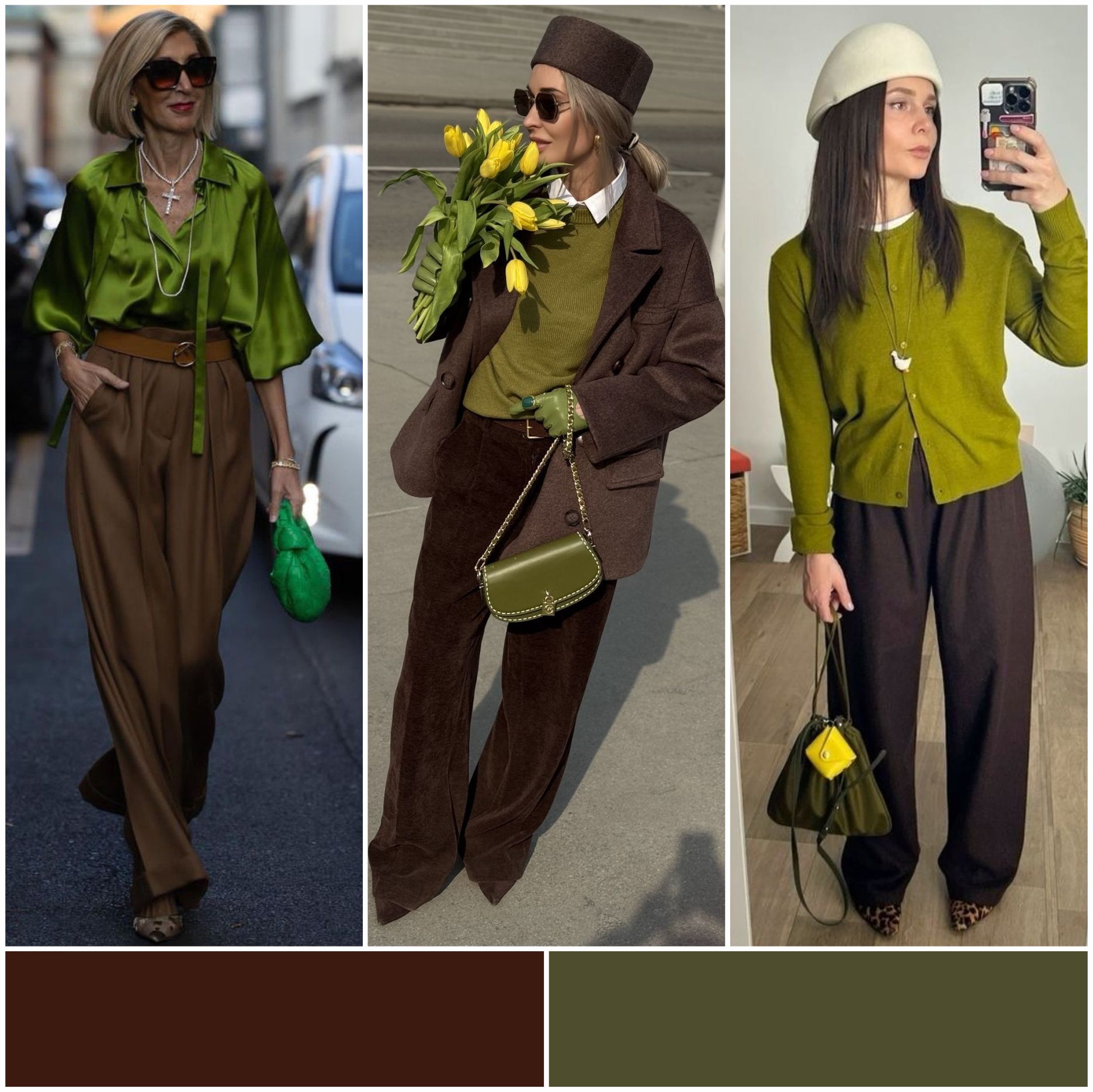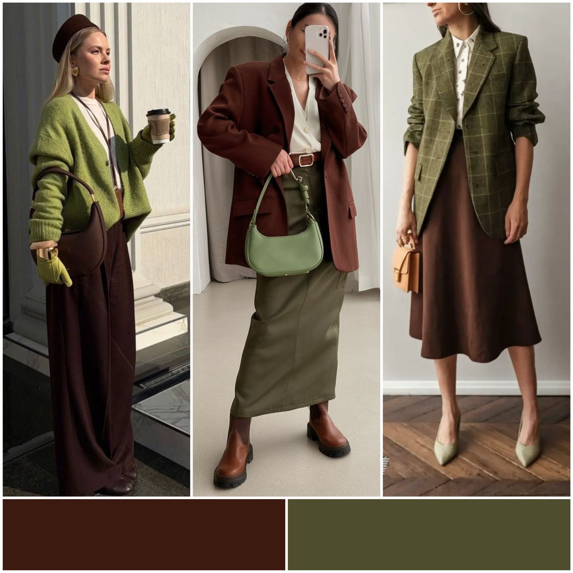Эта пара цветов идеально подходит для осени, ведь они перекликаются с природными оттенками. Шоколадный цвет добавляет глубину, а оливковый — свежесть. Вы можете выбрать оливковую куртку и сочетать её с шоколадными брюками или юбкой, создавая уютный и стильный образ.
