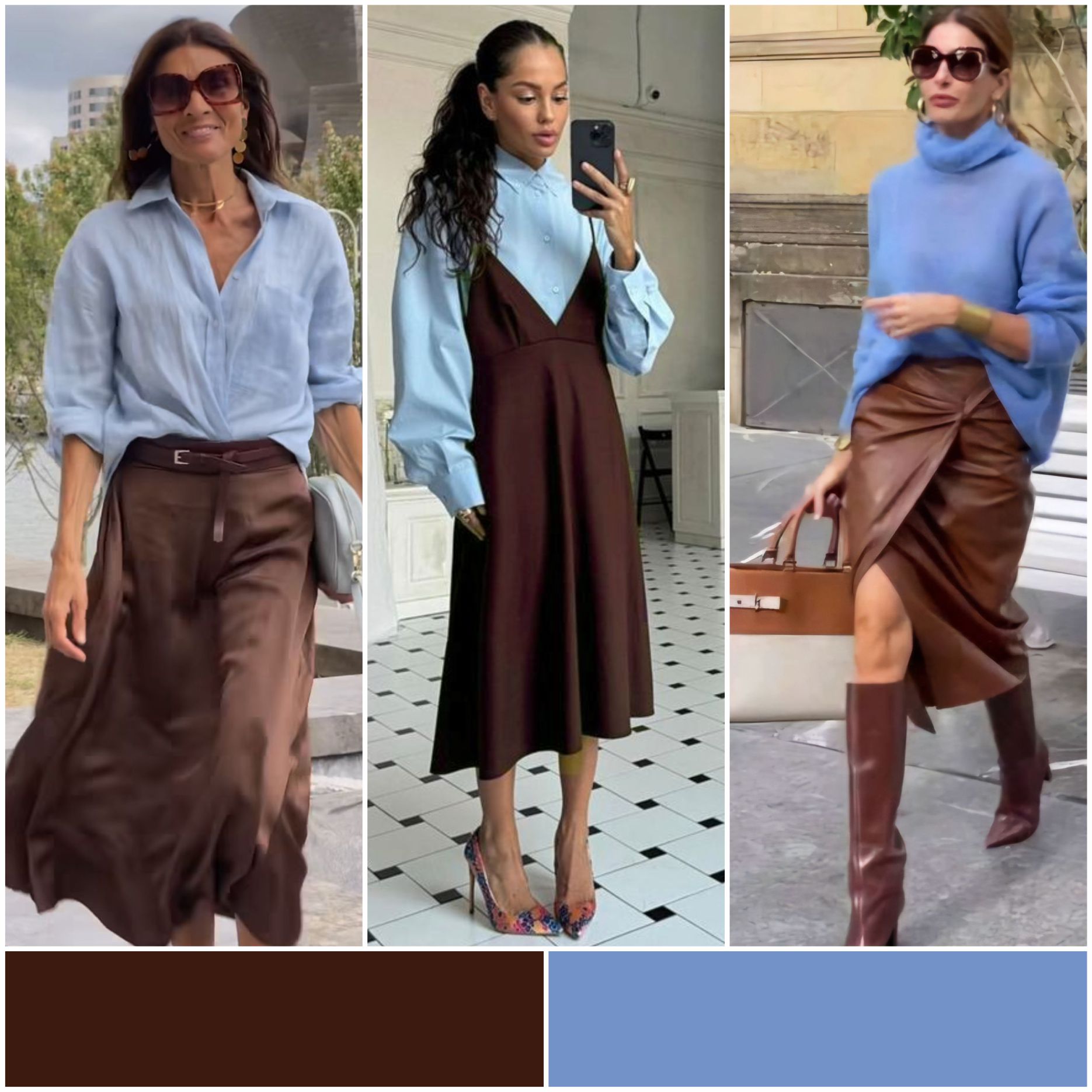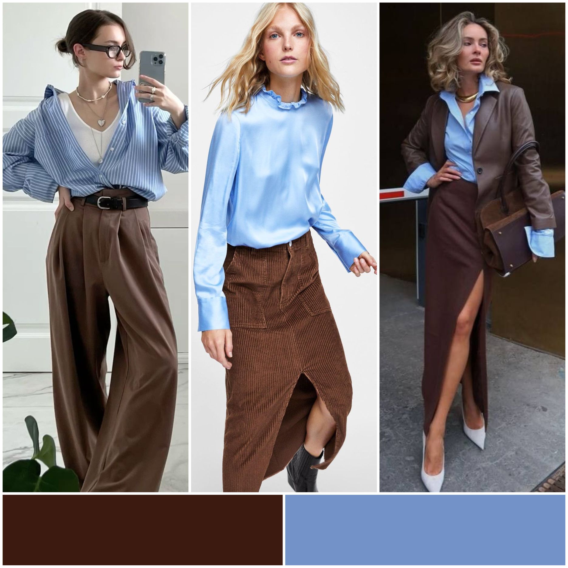 Эта комбинация напоминает о теплых осенних днях и спокойствии природы. Шоколадный цвет дарит уют и тепло, а голубой добавляет свежести и легкости. Попробуйте надеть шоколадное пальто с голубой блузкой или шарфом — такой образ отлично подойдет как для прогулки, так и для офисного стиля.