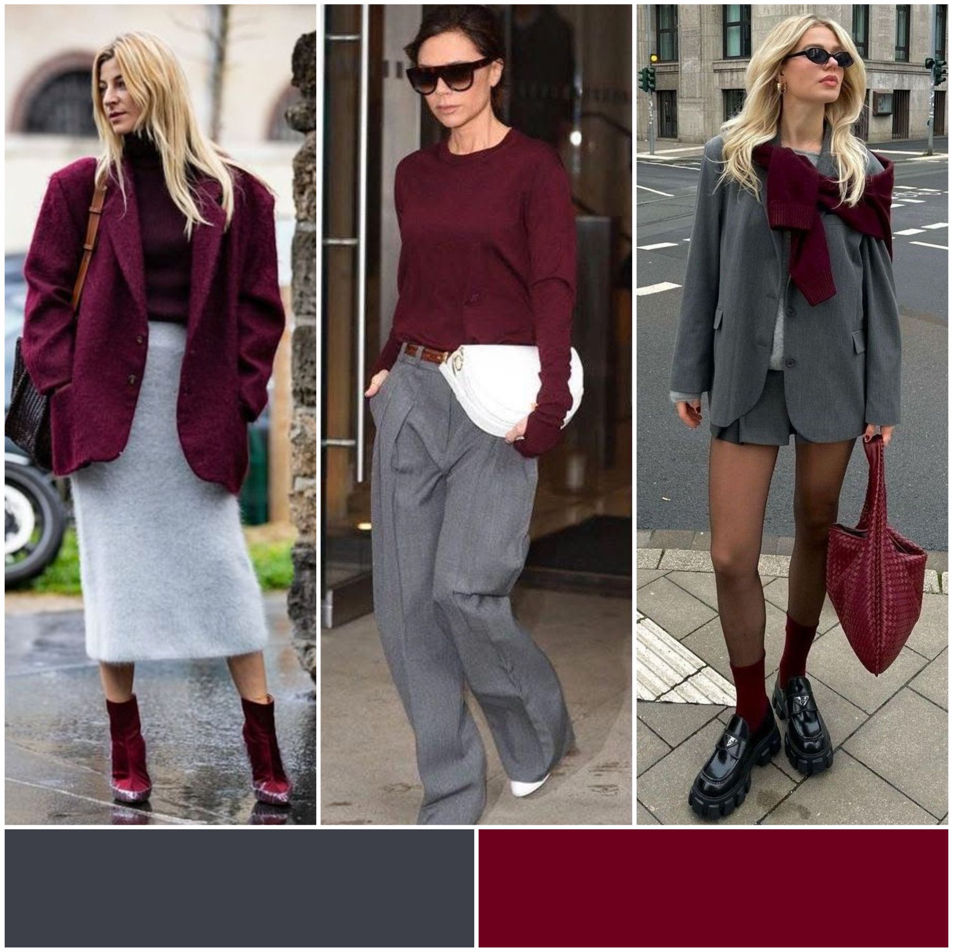 Серый цвет — это универсальный нейтрал, который легко комбинируется с другими оттенками. В паре с винным он создает эффектный контраст, добавляя образу глубины и изысканности. Например, серый свитер можно сочетать с винными брюками или юбкой. Добавьте аксессуары в тон, чтобы завершить образ!