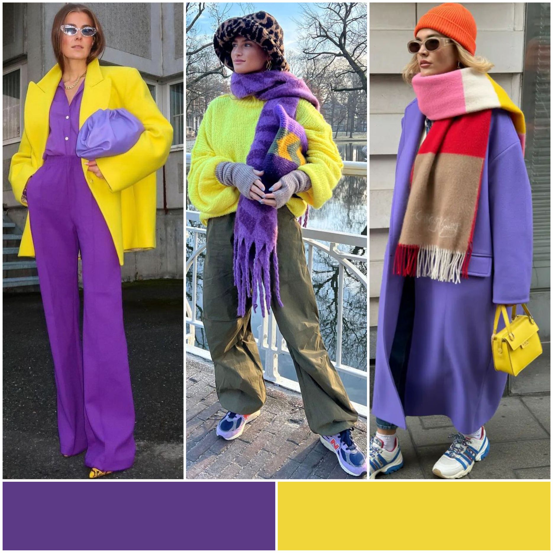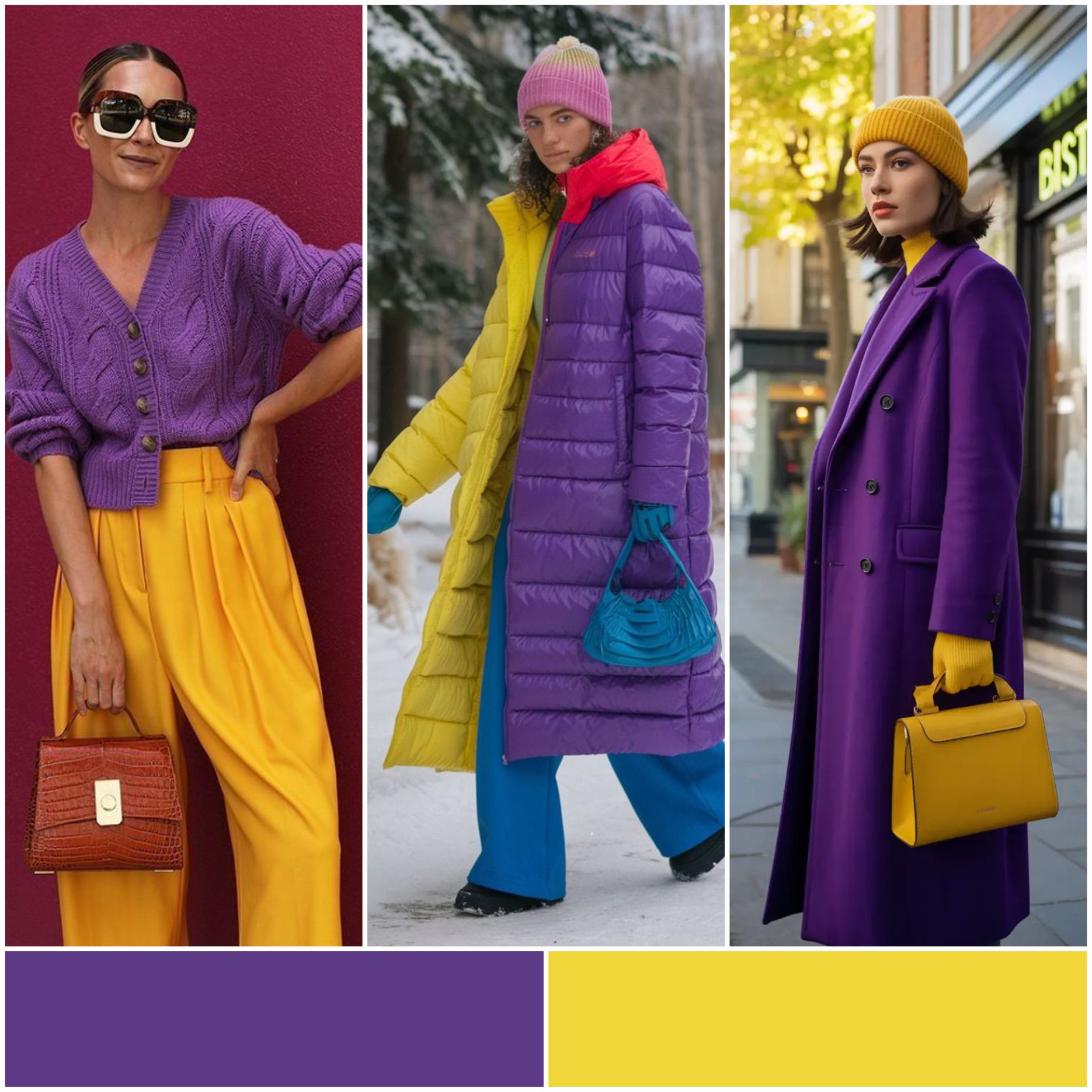 Это смелое сочетание для тех, кто не боится выделяться. Фиолетовый цвет символизирует креативность, а желтый — радость и оптимизм. Образ с фиолетовым пальто и желтыми ботинками станет настоящим акцентом в зимнем пейзаже.
