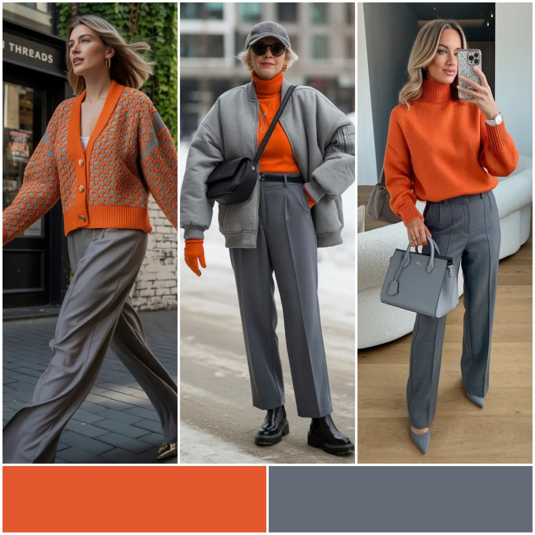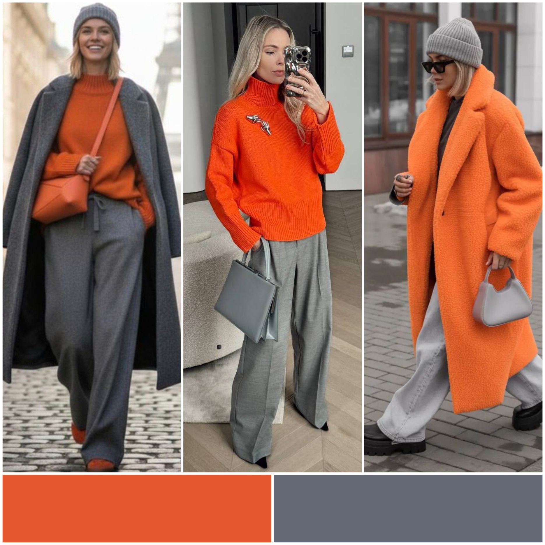 Серый — это базовый цвет, который легко комбинируется с разными оттенками. Оранжевый добавляет энергии и яркости. Попробуйте серую куртку с оранжевым шарфом или шапкой — такой контраст точно привлечет внимание и поднимет настроение!
