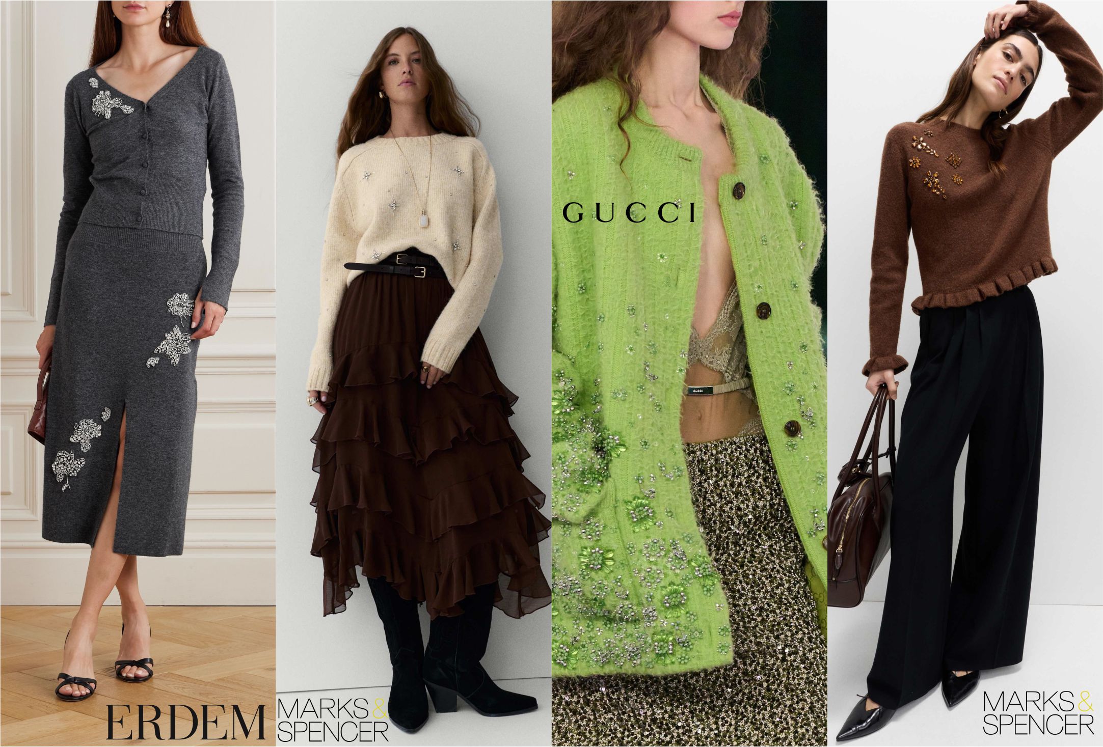 Одним из самых ярких трикотажных изделий во всех коллекциях стал лаймово-зелёный кардиган oversize от Gucci, расшитый стеклянными бусинами и цветочными мотивами. Simone Rocha также давно известна своими высокотехнологичными трикотажными изделиями и представила модели, украшенные лентами и бисером.