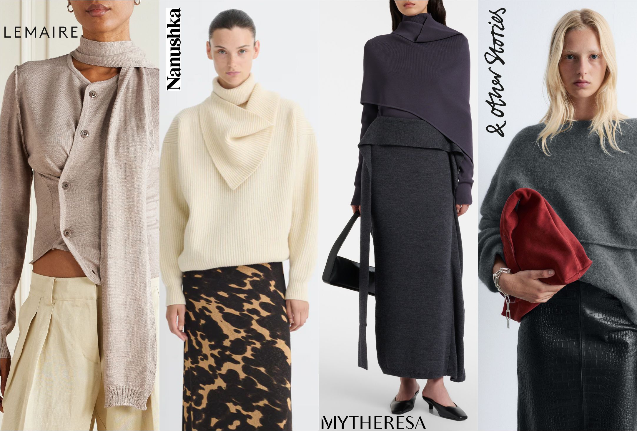 В прошлом году драпировки заполонили подиумы: объёмные шарфы, пончо и вязаные изделия двойной вязки. «Ничто не выглядит так гламурно (или дорого), как быть окутанным огромным количеством мохера, шерсти и кашемира». Этот образ актуален и зимой 2025 года: объёмные вязаные вещи, накинутые на тело, и джемперы со встроенными или подобранными шарфами. Всё дело в создании интересных форм и силуэтов.