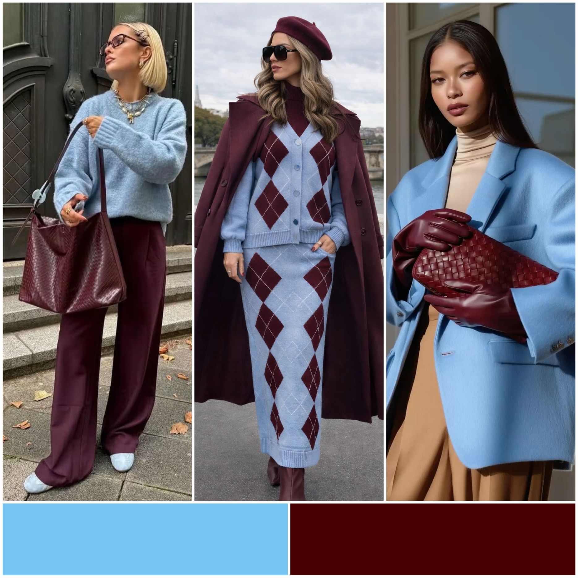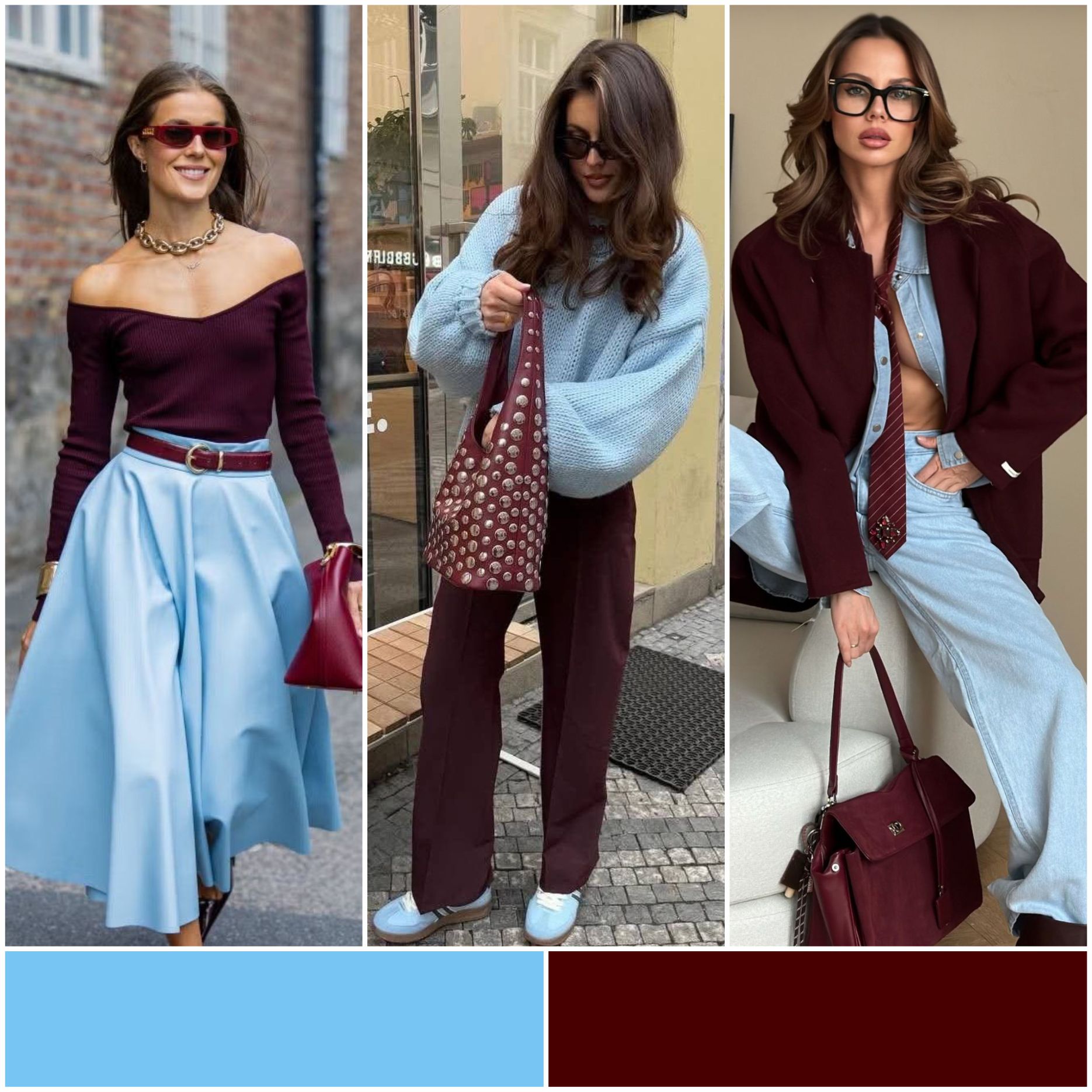Глубина и свежесть в одном образе. Бордовый добавляет драматичности, а голубой - легкости.