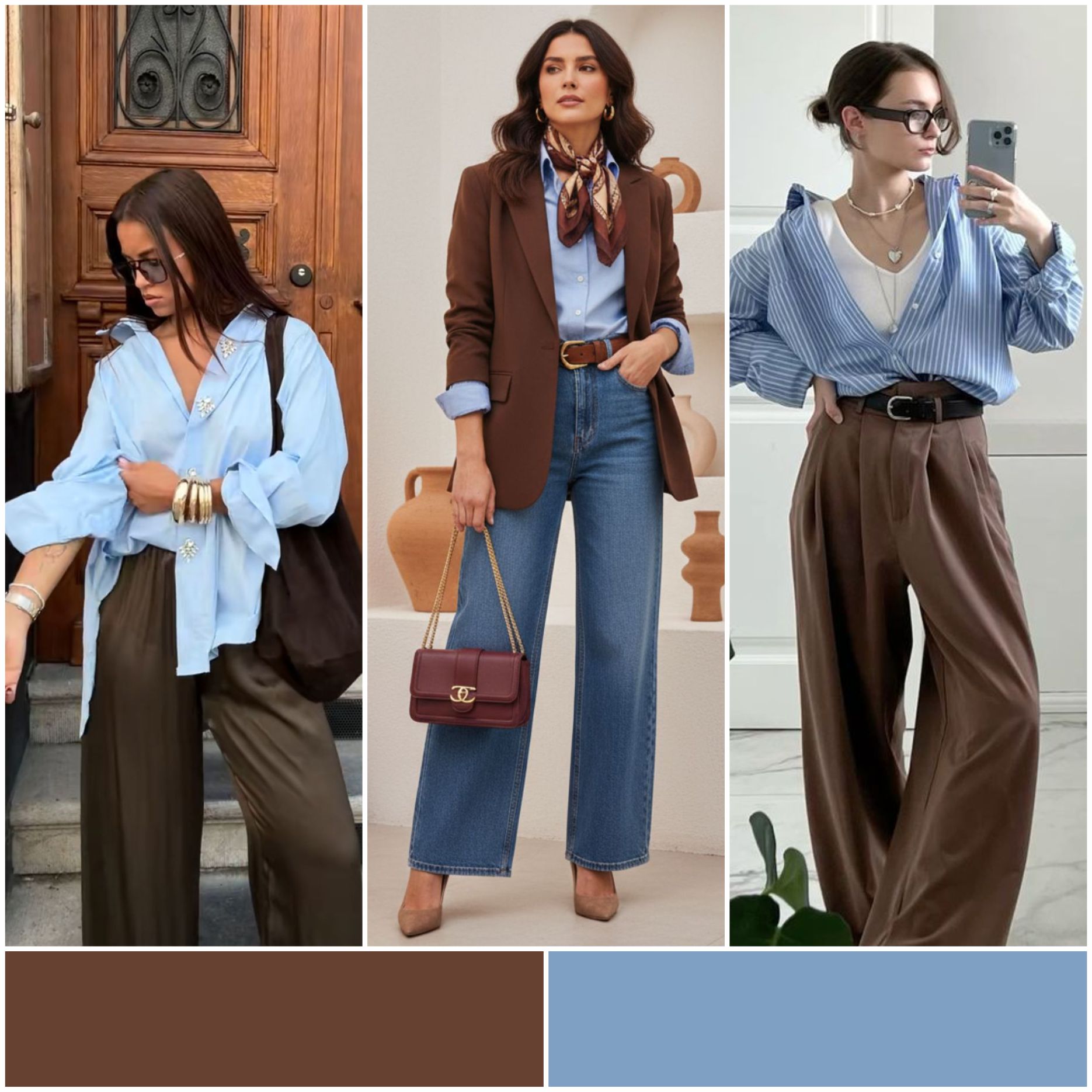 Голубая рубашка или джемпер прекрасно работают с шоколадным жакетом, замшевой сумкой или коричневой обувью.