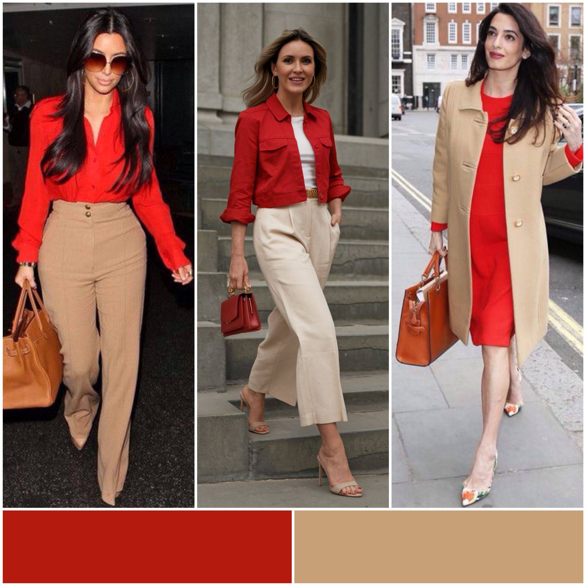 Нейтральная база и яркий акцент. Песочный смягчает насыщенность красного и делает образ элегантным, а не вызывающим.