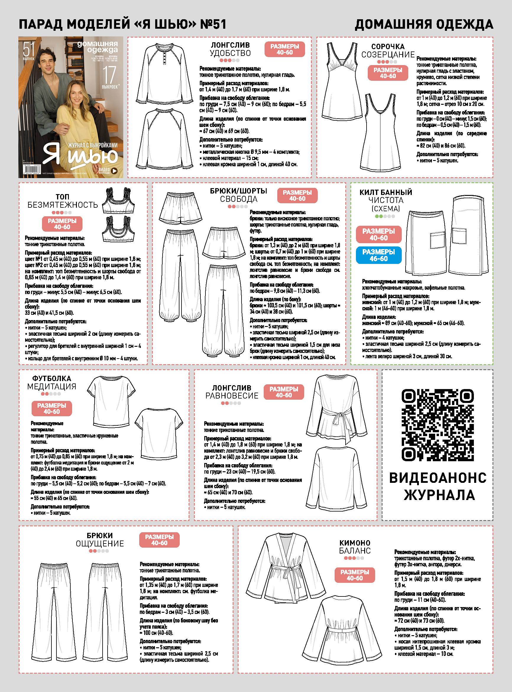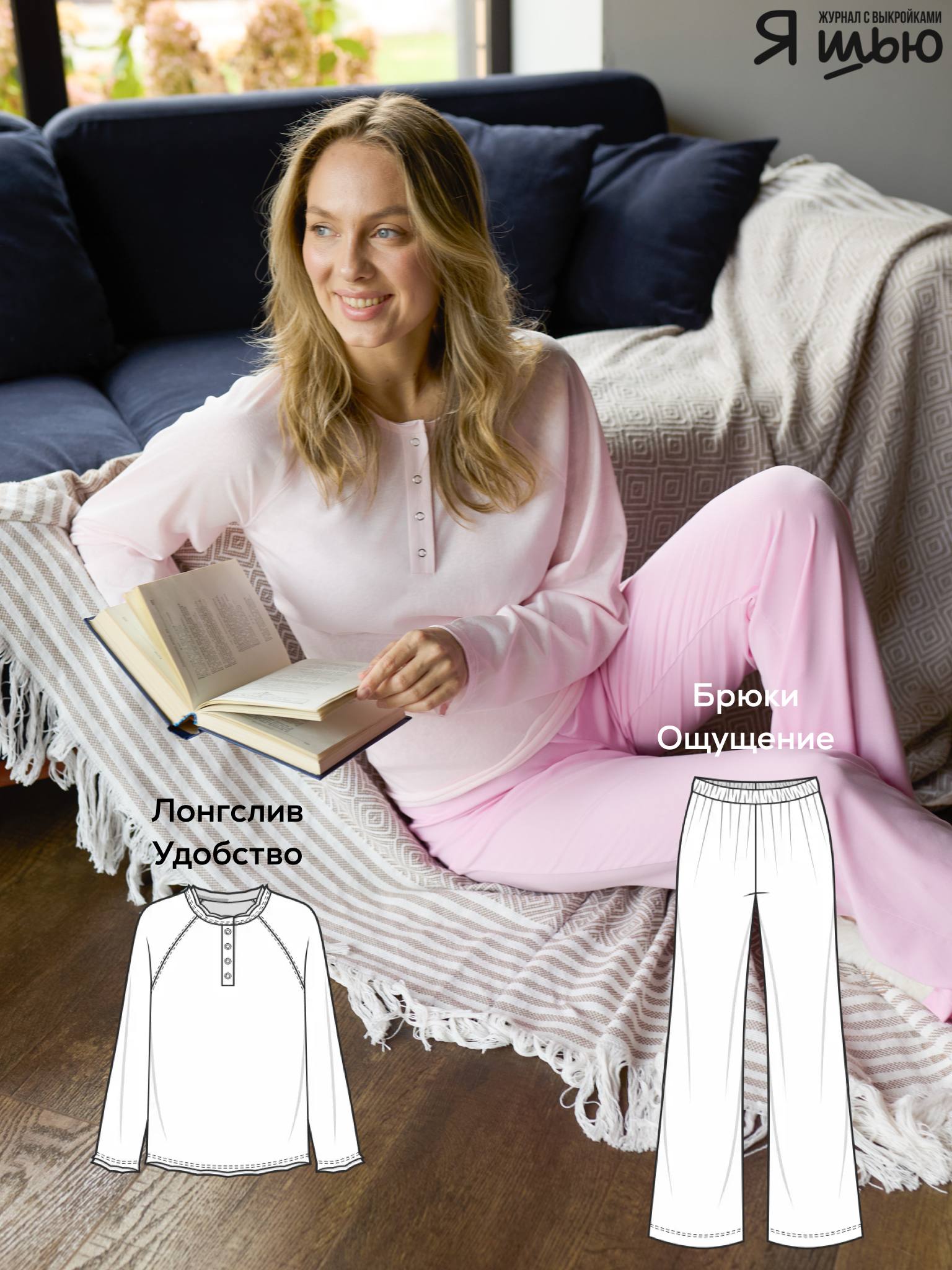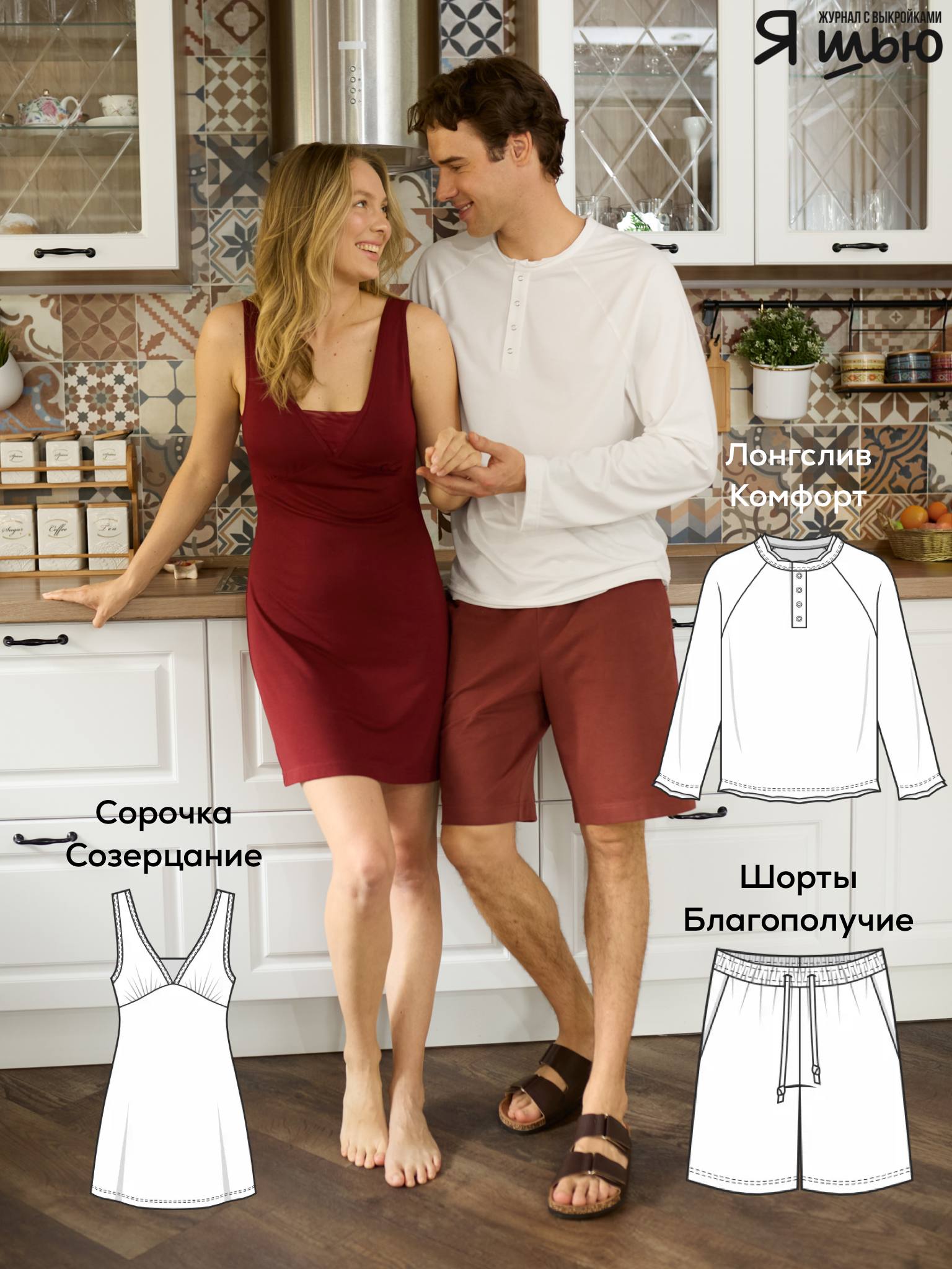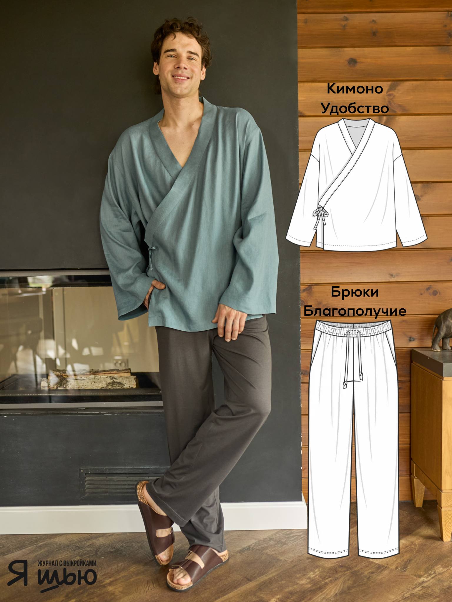 В номере представлены модели: легкий килт для бани, атласная пижама, комфортные лонгсливы, кимоно, шорты, брюки