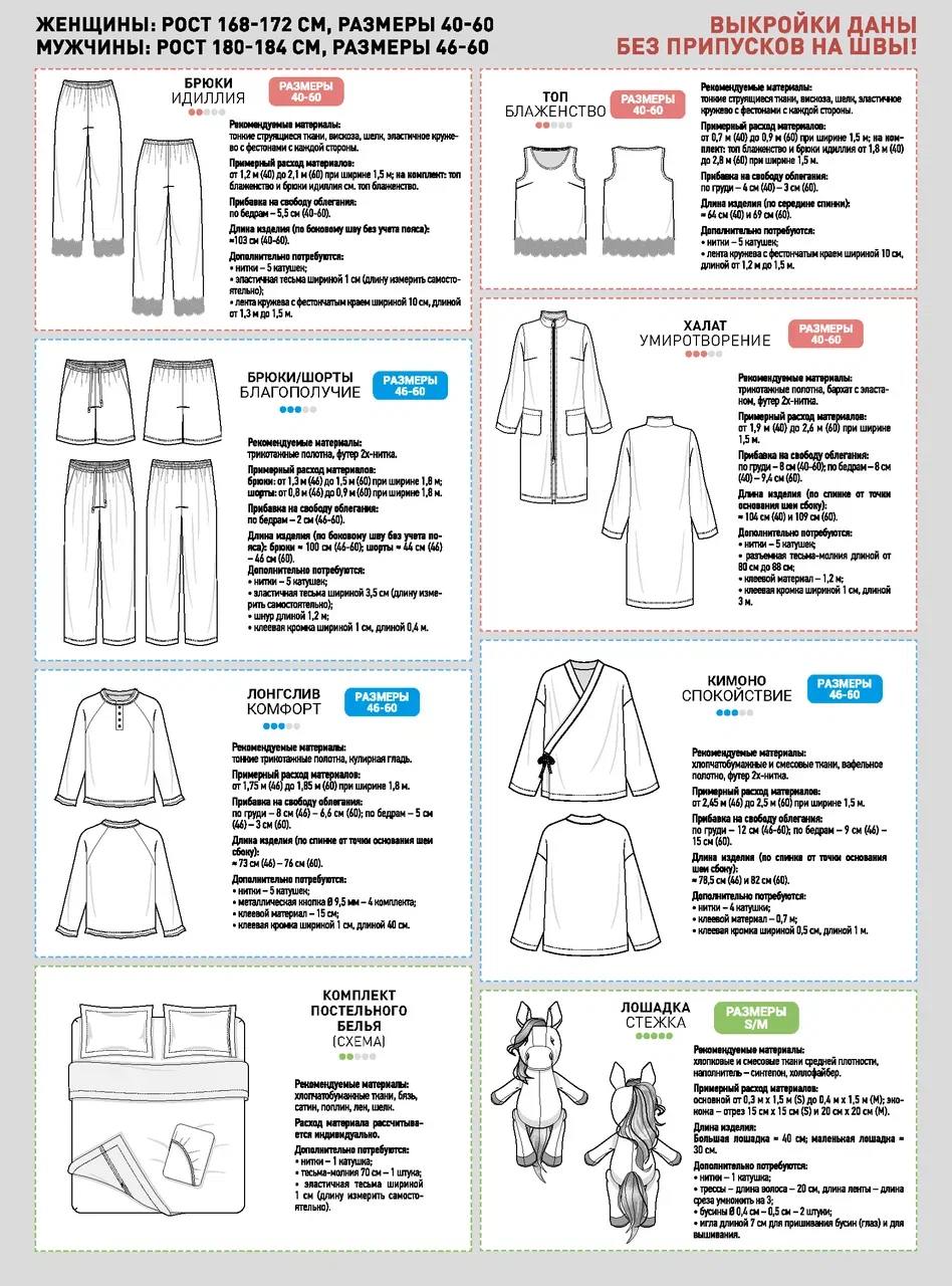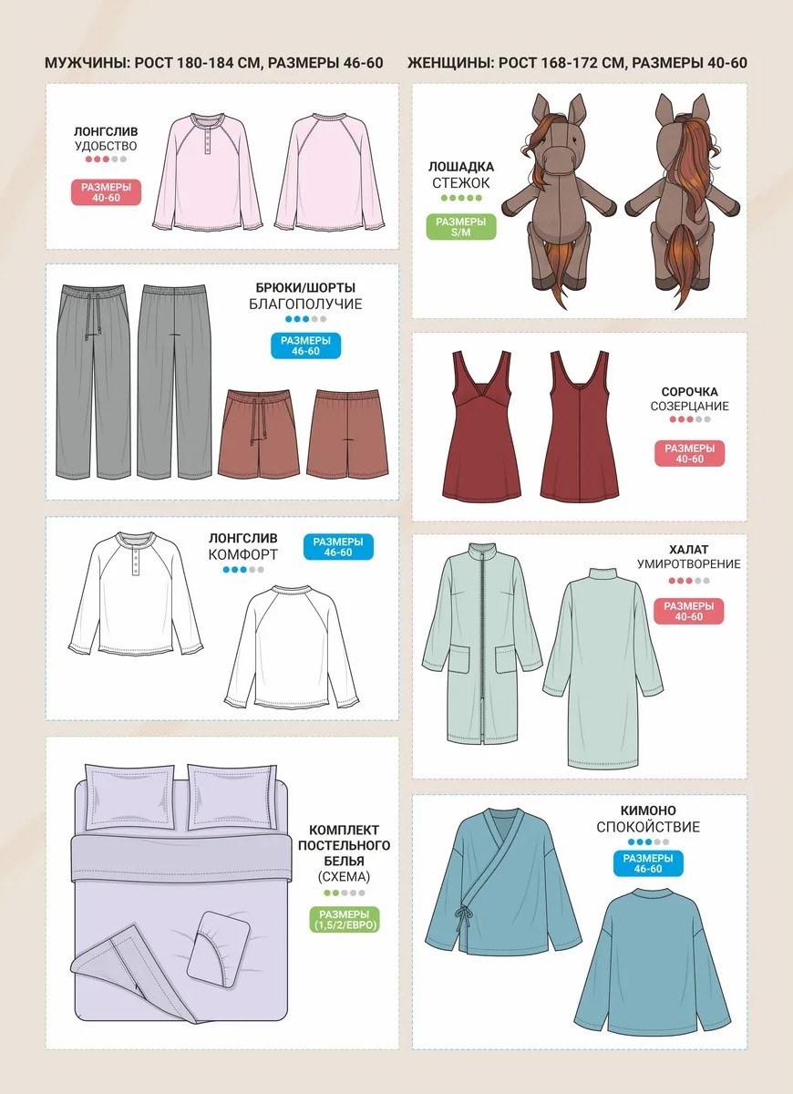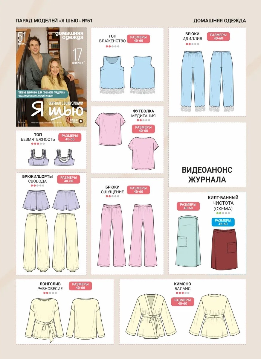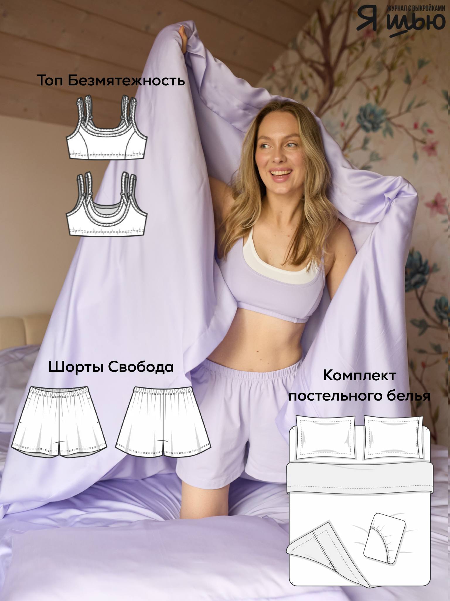 В номере представлены модели: легкий килт для бани, атласная пижама, комфортные лонгсливы, кимоно, шорты, брюки